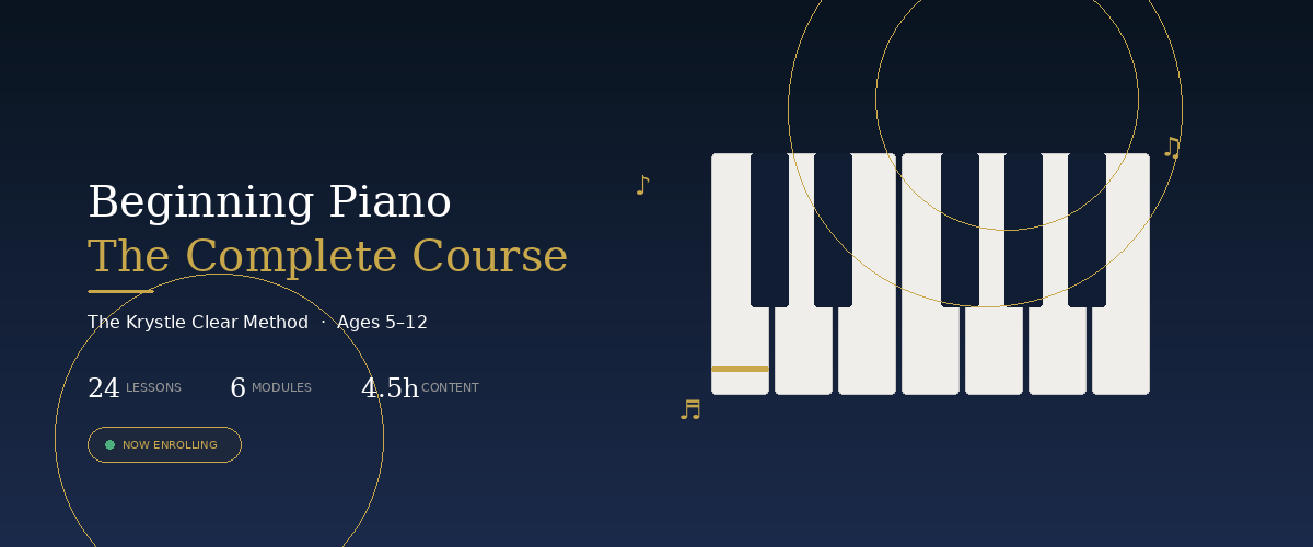 Whether your child is 5 or 12, the path is the same — clear, structured, joyful. By the end of this course, your student will read treble clef, play with both hands, understand rhythm and dynamics, and perform a recital piece with confidence.